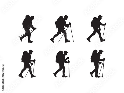 hiker, silhouette, backpack, pole, walking, people, group, activity, adventure, travel, mountaineering, trekking, journey, wanderlust, nature, recreation, sport, fitness, illustration, graphic, design, isolated, white, background, vector, art, icon, symbol