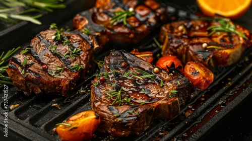 Sizzling grilled lamb chops seasoned with delicious BBQ spices and accompanied by tomatoes are showcased in a mouthwatering close-up