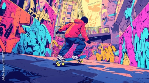 skateboarding, skater, urban, city, alley, graffiti, art, street, style, youth, culture, motion, speed, action, dynamic, energy, vibrant, colourful, illustration, graphic, design, colours, paint, spray, wall, building, perspective, movement, adventure, risk, freedom, skill, talent, fun, sport, lifestyle, ride, board, wheel, shoe, clothing, hoodie, person, male, boy, young, scene, background, artwork