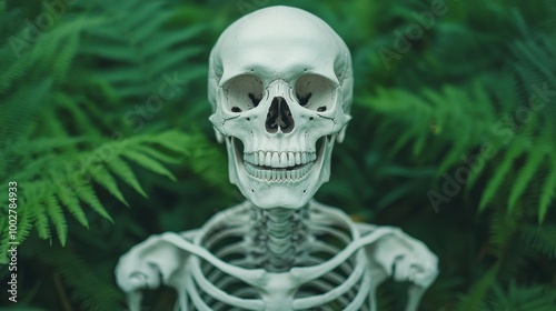 skeleton, anatomy, fern, greenery, nature, decoration, biology, study, education, health, science, smile, medicals, creepy, interior design, halloween, prop, pale, character, surreal, organic, museum, learning, visual, structure, realistic, natural, bone structure, display, background, texture, contrast, detail, environment, horror, curiosity, unique, theme, exploration, gesture, culture, grisly, fascination