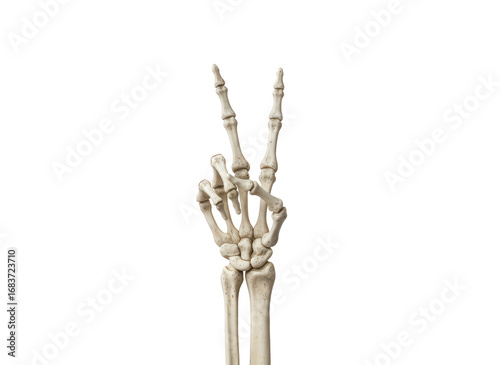 skeleton, hand, peace sign, victory, bone, anatomy, human, isolated, white background, skittish, halloween, gesture, symbol, finger, grisly, dead, death, medicals, science, health, body, creepy, fear, scarey, horror, graphic, design, illustration, still life, symbolism, structure, detail, ivory, beige, aged, vintage, retro, minimalist, simplicity, one object, studio shot, cut-out, macro, health care, medicine
