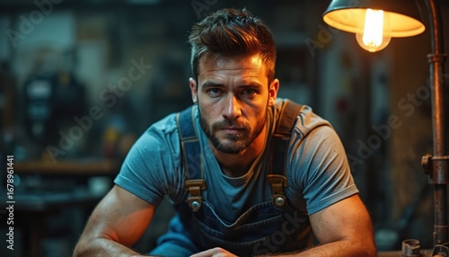 Skilled craftsman poses confidently in dimly lit workshop. Focused expression, rugged look reflect hard work, dedication, passion for craft. Portrait captures of manual labor, tradition, inspiring