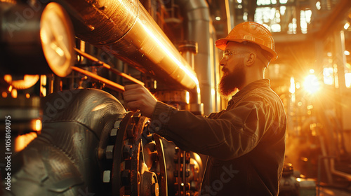 skilled engineer is performing maintenance on industrial equipment in factory setting, surrounded by pipes and machinery, with warm sunlight illuminating scene