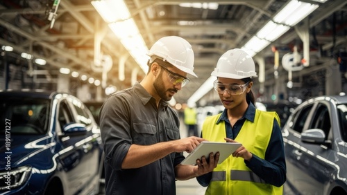 factory, automotive, car, production, manufacturing, digital, tablet, technology, collaboration, team, industry, modern, vehicle, men at work, quality, control, inspection, safety, eyeglass, professional, diverse, male, female, innovation, process, efficiency, planning, management, success, future, plant, facility, machinery, equipment, indoor, bright, sunlight, sharpened, connect, precise, analysis, solution, growth