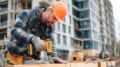 Skilled worker uses a power drill on wooden construction materials, wearing an orange safety helmet and work gloves in a daytime setting on a building site.