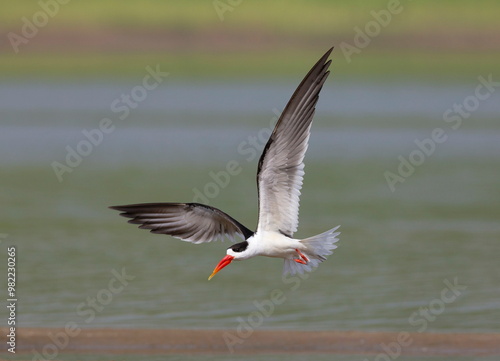 Skimmer in Flight, Tern-like birds in the family Laridae. Chambal River, Rajasthan, India