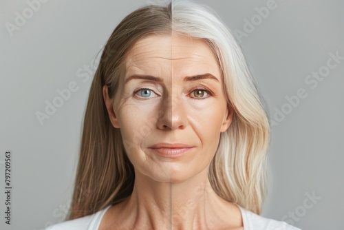 Skin health dynamics in aging contrast supported by resveratrol dialogue and facial age portrayal, aiming for texture exploration and moisturizer improvements in half-face aging symmetry.
