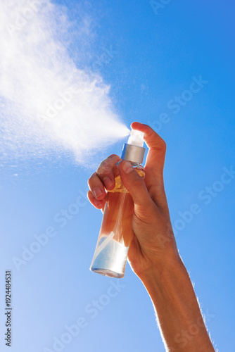 Skincare Product Hand Spraying Face Mist Bottle Against Blue Sky