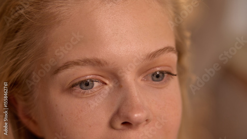 Skin-realism. Closeup of woman's face showing natural pores, skin texture, and subtle shine. Concept of beauty simplicity and natural skincare.