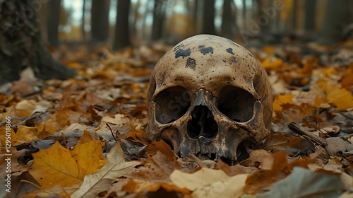 skull, autumn, leaf, forest, mystery, death, halloween, nature, background, fall, bone, skittish, wood, creepy, season, dark, scarey, tree, yellow, orange, brown, ground, still, life, photo, image, picture, photo, concept, illustration, design, template, texture, vintage, old