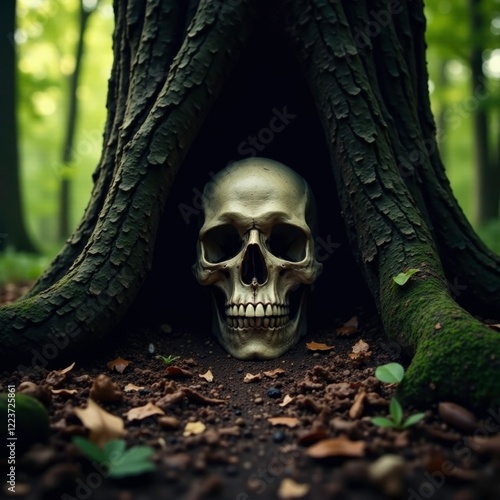 Skull emerging from the dark recesses of a hollowed-out tree, forest floor, mysterious skull
