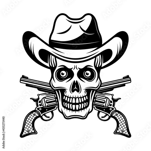Skull in cowboy hat and two crossed pistols vector illustration in monochrome vintage style isolated on white background