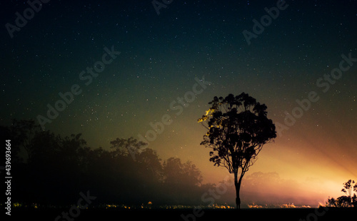 astronomy, beam, dark, flash, galaxy, landscape, light, nature, night, outdoors, outer space, road, silhouette, skull, sky, star, sunset, tree