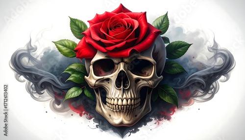 skull, rose, smoke, death, art, floral, grim, beauty, vintage, illustration, decorative, elegant, graphic, realistic, detail, head, pale, red, flower, dark, light, grey, bone, image, nature, romantic, tattoo, design, intricate, composition, symbolic, art nouveau, decoration