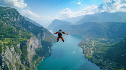 Skydiver in mid-air above a scenic mountain lake, capturing the thrill of extreme sports and beautiful landscapes.