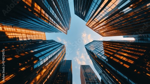 sky, highrise, city landscape, architecture, city landscape, detail, light, downtown, business, structure, tall, building, window, perspective, vertical, glasses, bright, gold, angle, exterior, upward, view, city, modern, skyward, facades, urban