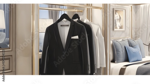 Sleek and Minimalist Image of Black Pants Hanging Neatly on a Metal Rack in a Modern Neutral Toned Room Interior
