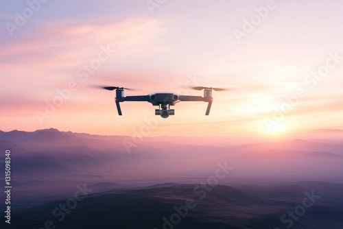 sleek drone hovers gracefully over picturesque landscape at sunset casting dramatic silhouette against vibrant sky
