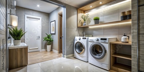 Sleek laundry room showcases a large washing machine paired with a fashionable bathroom, exemplifying modern design and