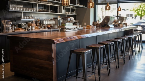 sleek, wood, counter, illustration, modern, trendy, hot drink, shop, dark, stained, glossy, finish, chic, sophisticated, vibe, industrial, style, stool, inviting, client, to sit, enjoy, design, decor, ambience, barista, seating, atmosphere, contemporary, aesthetic