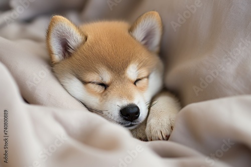 shiba inu, puppy, sleeping, blanket, soft, cream, nap, comfort, pet, dog, rest, cosy, cute, animal, home, relaxation, young, fluffy, tranquil, adorable, breed, domestic, cuddled, slumber, canino, furry, friends, quiet, warmth, companion, innocence, soothing, indoor, mammal, cuddly, purebred