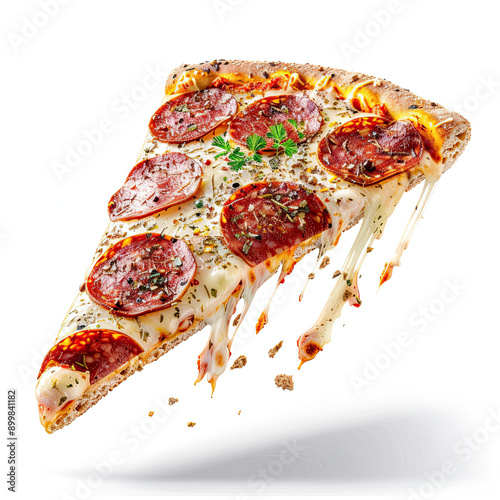 Slice of salami pizza floating in the air isolated on white background delicious and appetizing slice vibrant and colorful toppings mouth-watering and cheesy pizza dynamic and fun presentation perfect