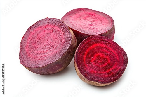 Sliced beetroot arrangement rich vibrant color closeup view white background captivating still life food photography showing fresh vegetable organic texture diet concept
