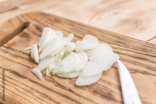 Sliced onions with half rings on a wooden chopping board on a wooden background.