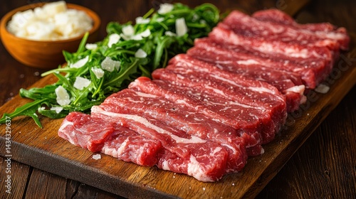 steak, meat, beef, sliced, food, epicure, cookery, delicious, protein, grill, bar-b-q, dinner, lunch, arugula, salad, greener, cheese, parmesan, wooden, board, cutting, fresh, raw, healthy, marbling, culinary, meal, eatery, plate, dish, serving, portion, butcher, cook, preparation, ingredient, tasty, nourishment, diet, starter, garnish, eat, gastronomy, nobody