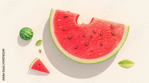 Sliced watermelon with a bite taken out, accompanied by seeds and a small slice on a light background