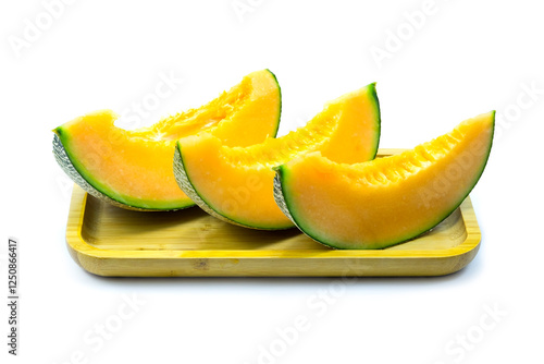 Slices of melon, Group of 3 pieces cut Japanese melons,honey melon or cantaloupe (Cucumis melo) in wooden tray isolated on white background closed up stack