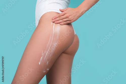 Slim womans legs. Cosmetic cream on woman buttocks with clean soft skin. Applying moisturizer cream on ass. Cellulite or anti cellulite treatment. Body care and spa salon concept.