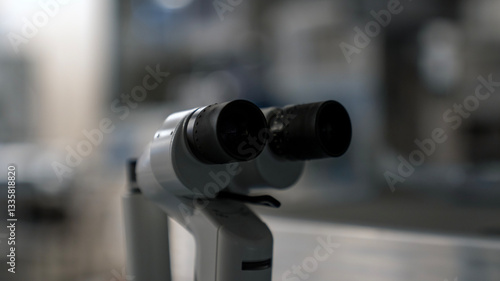 Slit Lamp Microscope Used for Eye Examinations in Human and Cat, Dog, Pet Veterinary Care. Ophthalmology Equipment for Diagnosing Eye Diseases. Animal Ophthalmology, Optometry.