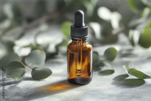 Small amber dropper bottle surrounded by eucalyptus leaves in natural light. Generative AI
