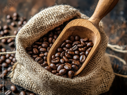 Small batch coffee embodies craftsmanship and attention to detail. A burlap sack filled with coffee beans and a wooden scoop resting on top.