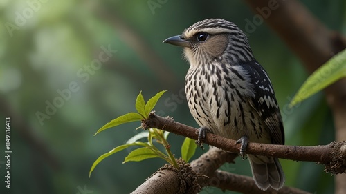 bird, small, perched, tree branch, foliage, nature, wildlife, forest, closeup, detail, feather, wing, fauna, avian, cute, brown, grey, white, black, speckled, pretty, portrait, animal, photo, natural, tropical, spring, summer, garden