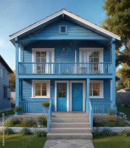 Small blue house with a porch and a window on the front , single story, entrance, exterior shot
