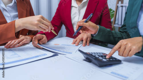 small business accounting team meeting three asian people with salary monthly charts data, basic business accounting and bookkeeping concept.