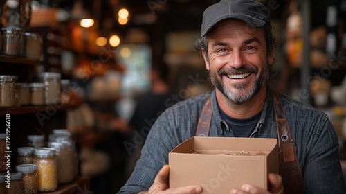 business, owner, man, entrepreneur, cardboard box, delivery, shipping, warehouse, box, cardboard, smiling, bearded, shop, small business, storage, logistic, commerce, product, retail, hand-made, craft, store, men at work, apron, rustic, warm, organised, independent, hard-working, customer service, box, jar, happy, brown, grey, shelf, product, cosy, indoor, merchant, casual attire, professional, shopkeeper, inventory, good, cheerful, shopkeeper, person, working