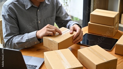 Small business owner packing boxes for delivery, showcasing logistics and organization. Ideal for e-commerce and remote work themes.
