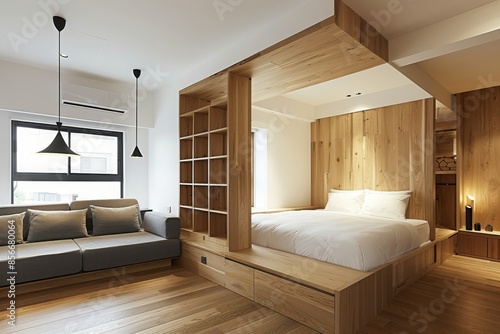 generative, ai, small, room, apartment, interior, space, bedchamber, wood, home, flat, design, japanese, asian, asia, zen, warm, accessory, furniture, style, modern, table, light, comfortable, bright, partition, minimalist, wooden, luxury, concept, wall, white, architecture, hotel, relax, cream, lamp, contemporary, furnishing, blind, trough, elegance