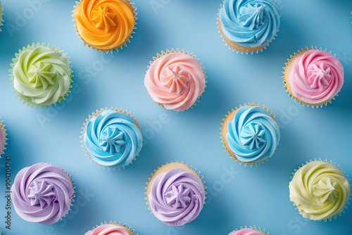 Small cupcakes in vibrant colors on pastel blue background with blank space on the side. Ai generative