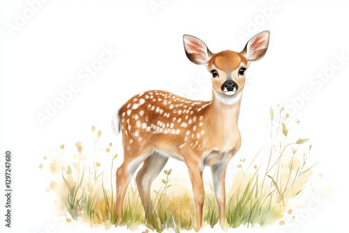 fawn, wildlife, cute, animal, nature, wild, isolated, cervid, beauty, baby, watercolor, mammal, white, design, background, young, forest, portrait, art, illustration, artistic, hand, vignetting, drawing, brown, drawn, fauna, small, colours, childcare center, banner, figure, standing, painting, wood, decor, header, spotted, farm, artwork, card, green, grass, big eye, sweet