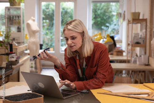 female, fashion, technology, laptop, small business, startup, loan, banking, finance, smartphone, phone, mobile phone, mobile, working, businesswoman, owner, entrepreneur, woman, young adult, office, studio, designer, thinking, looking, future, creative, occupation, skill, trade, modern, 20s, copy space, student, computer, smiling, notebook, online