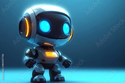 small futuristic robot with glowing blue eyes and orange lights standing on a blue illuminated surface with a dark gradient background, showing a friendly and curious expression