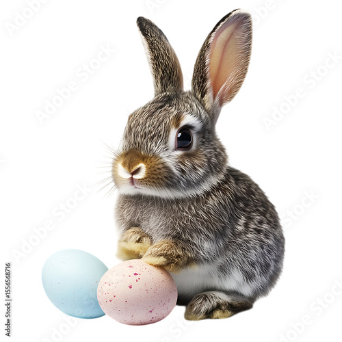 Small fuzzy baby rabbit sits near pastel colored eggs suggesting a charming marketing image for spring holidays.