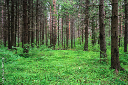 trunk, wood, forest, tree, green, russia, fir, spruce, pine, coniferous, glade, scenic, landscape, grass, summer, nobody, fir-wood, bole, bush, countryside, travel, tour tourism