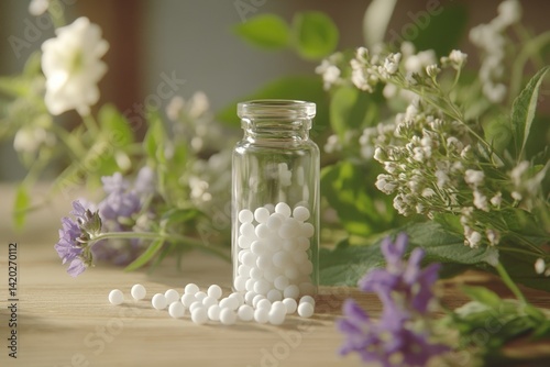 Small glass bottle filled with white homeopathic pellets placed on wooden surface surrounded by fresh herbs and delicate blooming flowers