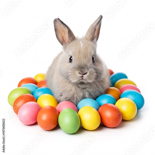 rabbit, rabbit, small, grey, white, easter bunny, easter egg, colourful, egg, surrounded, sitting, isolated, white background, easter, holiday, spring, celebration, cute, adorable, animal, pet, nobody, studio shot, festive, composition