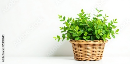 Small green bush in a wicker basket on white background, botanical, decorative items, wicker basket